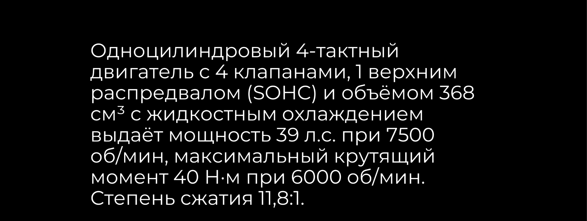 Силовая установка представлена одноцилиндровым 4-тактным двигателем. Объём двигателя 368 см³, мощность 38,8 л.с. Оснащён инжектором BOSCH, системой жидкостного охлаждения и вариаторной трансмиссией. Запуск двигателя осуществляется с помощью бесключевого доступа.